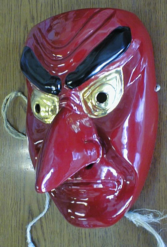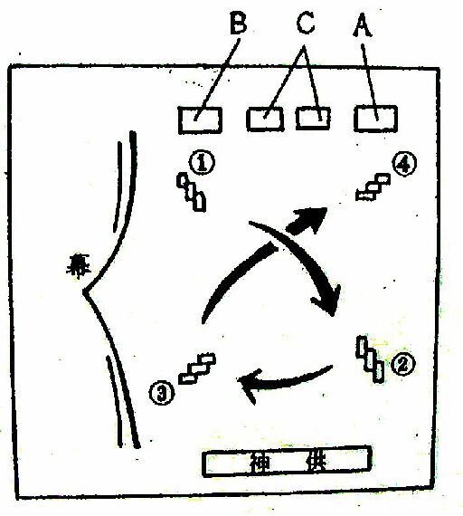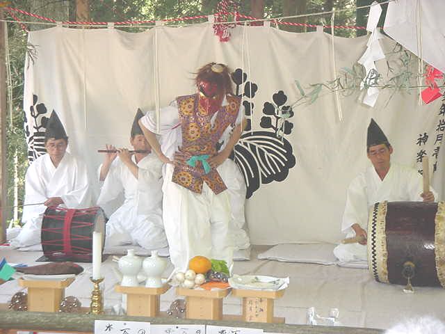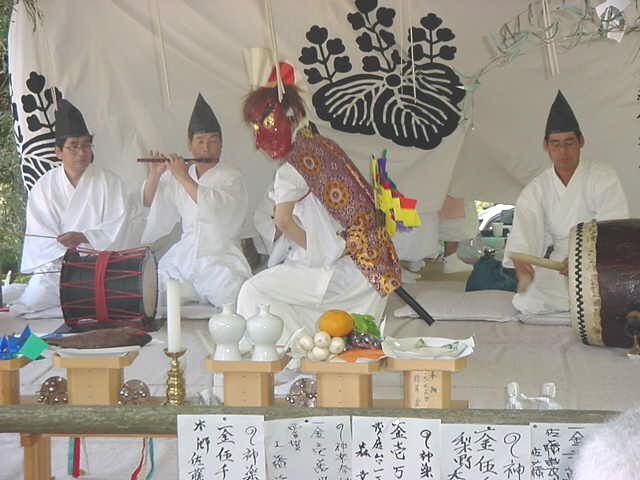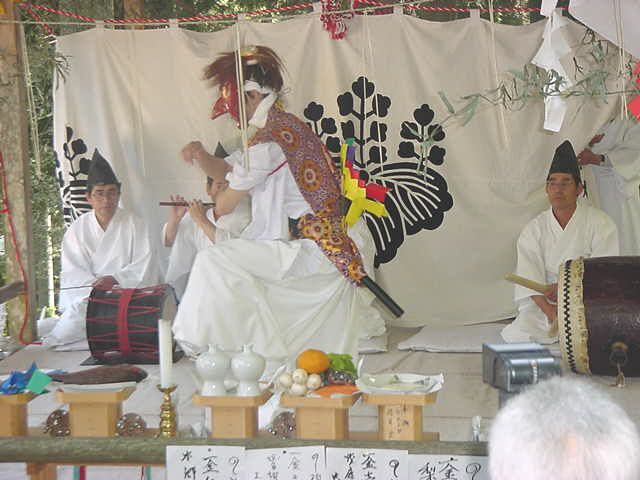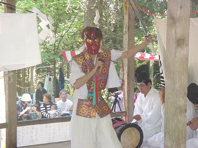 | 悪を篩い落とし、汚れを清める舞。舞手はザンギリをかぶり、大きな目の赤い面をつけ、 法衣を着て右手に扇を持ち、腰に刀をさして色紙の御幣束を背負う。舞台の正面に出ると正面に向か って足を大きく広げ腰を落とし、両手を腰に当て、 深々と2回拝礼をして舞に入る。まず、 「扇三番」(前述の通り)を行う。次に「幣束三番」を行う。これは、背中から御幣束を取り出し、 参照図のように舞台の四方に置く。御幣束を置くときは、一度飛び跳ねる。その後、舞台に置いた 御幣束を取って背負う。次に刀を取り出して左手に持ち、右手には鈴を持って舞う。舞が終わると、 登場のときと同様に拝礼をして退く。演技時間は約20分である。 |