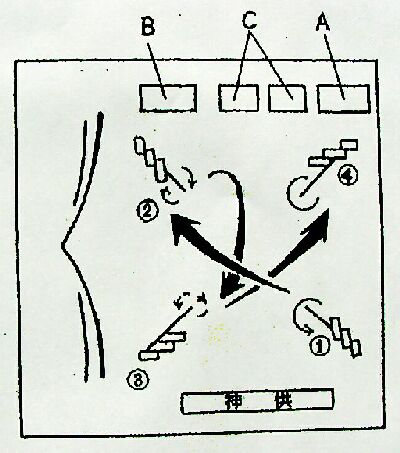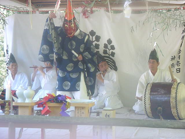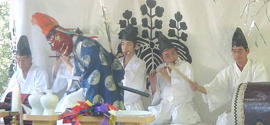 土地を祓い固め神を鎮めまつる舞。 舞手は鳥兜をかぶり、目が大きく鼻の高い朱色の面を付け、 狩衣を着る。右手に扇を持ち、腰に刀をさし、4本の白い御幣束を背負う。扇で顔を伏せるようにして 登場した後、正面に向かって足を大きく広げ腰を落とし、両手を腰に当て、 深々と2回拝礼をして 舞に入る。まず「扇 三番」(さんば)を行う。これは、扇を翳しながら顔を左右に動かし、 同時に足で舞台を左右の順に強く踏むものである。これを3回繰り返した後、「幣束三番」を行う。 これは、背から御幣束を1本取り、左手でそれを立て、右手の人さし指で天と御幣束を順に指さし、 その回りを片足で跳び回る。これを2回繰り返した後、御幣束を外側に向けて倒すものである。 残り3本の御幣束も同様に倒す。4本全て倒し納めると舞は終わり、登場のときと同様に拝礼をして退 く。演技時間は約20分である。 |