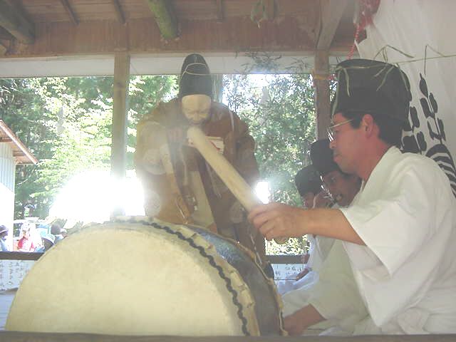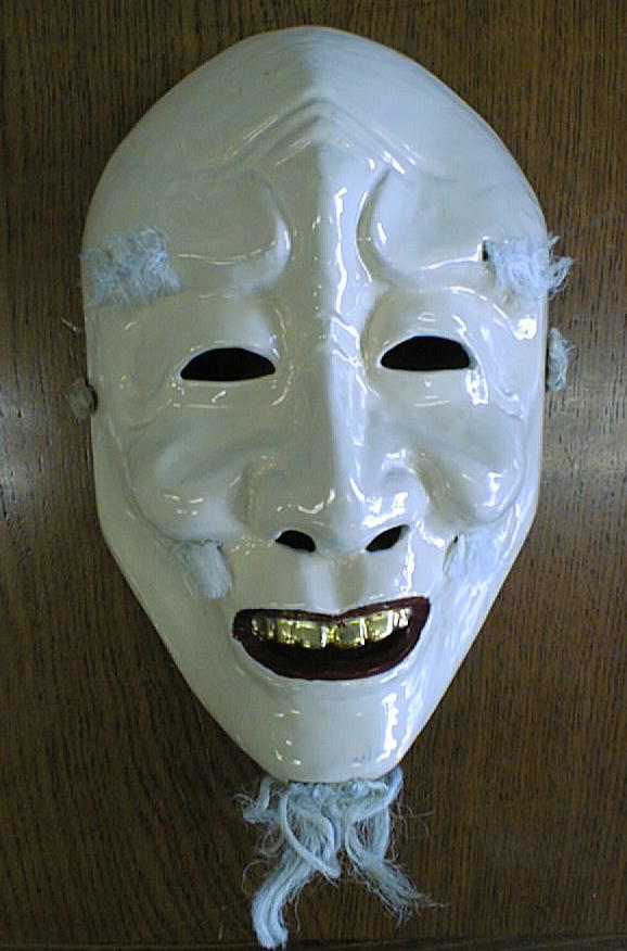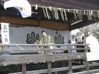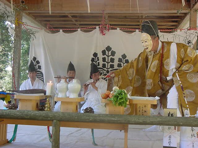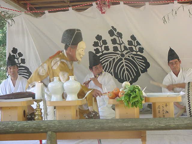 | 真榊とは、榊の美称。神饌を奉り、神を崇める舞。舞手は烏帽子をかぶり、翁のような白い面をつけ、狩衣を着て襷をかけ、 右手に扇を持つ。扇で顔を伏せるようにして登場し、正面に向かって足を大きく広げ腰を落とし、両手を腰に当て、 深々と2回拝礼をして 舞に入る。まず、「扇三番」(前述の通り)を行う。次に、四方に腰を落として屈みこむ。そして、扇を左手に持ち替え,右手に鈴を持ち、扇を振り、 大きく足踏みして四方をまわりながら舞う。終了後、登場のときと同様に拝礼をして退く。演技時間は約15分である。 |