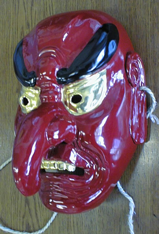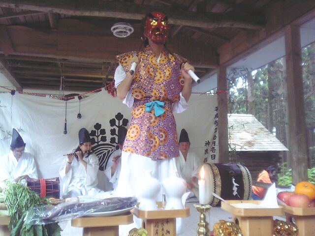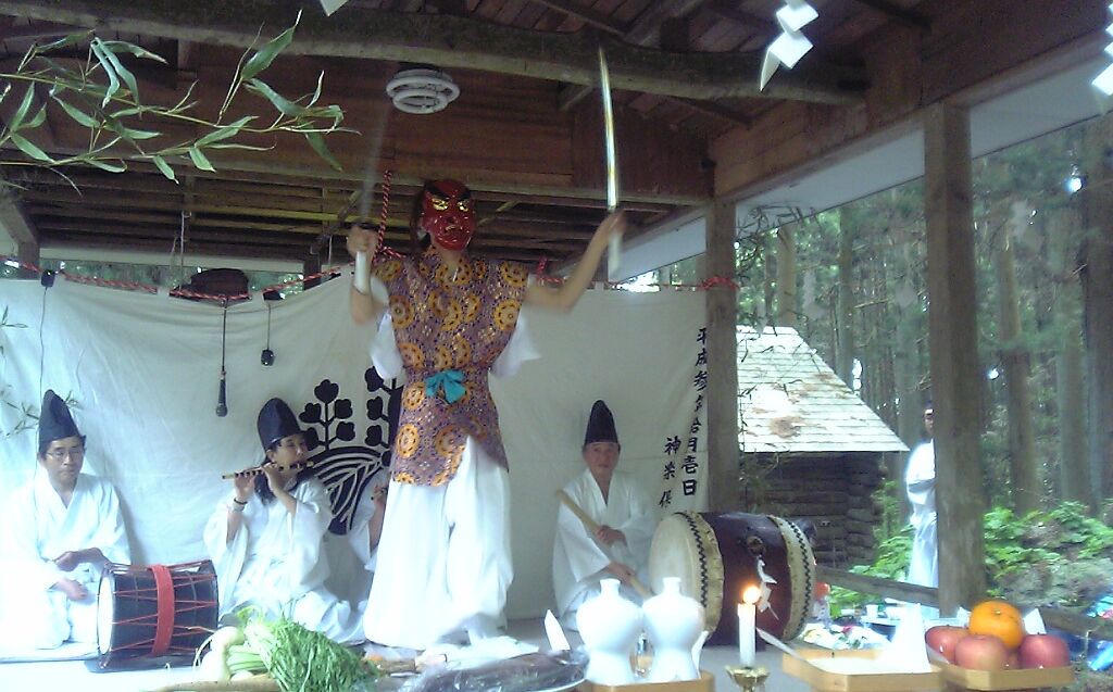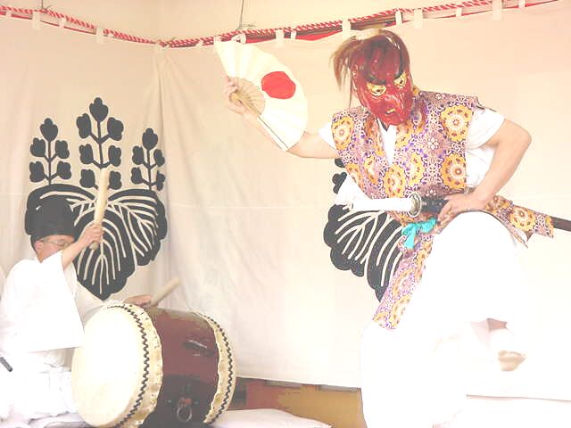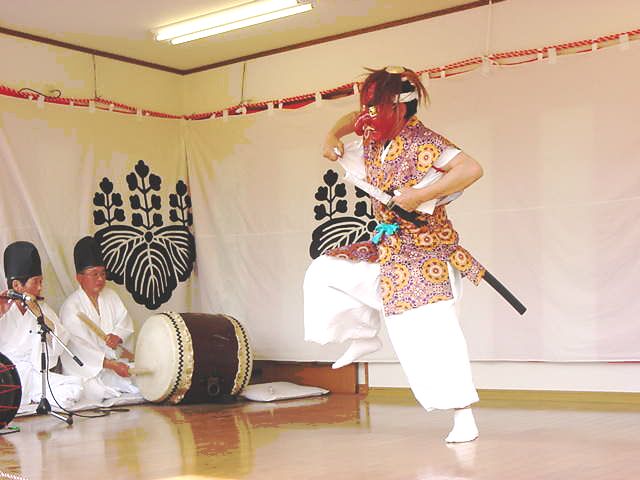 | 神社の境内や演技する舞台を祓い清め、神を鎮めまつる舞。舞手はザンギリをかぶり、 赤色の面をつけ、法被を着て右手に扇を持ち、腰に刀をさす。舞台の正面に出ると正面に向かって 足を大きく広げ腰を落とし、両手を腰に当て、 深々と2回拝礼をして舞に入る。まず、「扇三番」 (前述の通り)を行う。次に「指三番」を行う。これは、指二本をのばして左右に振り、片足で飛び 跳ねながら舞うものである。次に「袖三番」を行う。これは、袖の端を持ち、足踏みしながら舞うも のである。このとき、首も大きく振る。次に「二本剣」を行う。これは、腰にさした刀と神饌の前に 置いた刀を抜いて、2本の刀を重ね合わせて、左右に大きく足踏みしながら舞うものである。最後に 「刀三番」(前述の通り)を行う。これを2回行う。終了後、二本の刀を重ね合わせたまま、登場のと きと同様に拝礼をして退く。演技時間は約25分である。 |