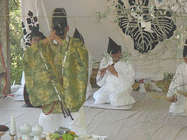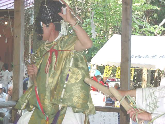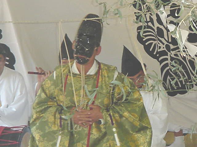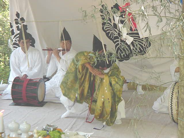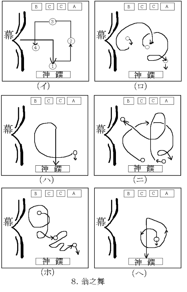 | 年老いても健康な姿を表した舞で、長老の知恵に感謝し、長寿を祝い、健康を祈る舞である。 舞手は烏帽子をかぶり、黒色の翁の面をつけ、狩衣を着る。右手に鈴を持ち、腰には短刀をさす。 初めに顔を左右に振りながら正面の神供の前に座る。次に合掌して2度拝礼をする。その後、舞台の 四方で、同様に顔を左右に振りながら合掌して屈みこむ。次に、正面に座りこみ、短刀を取り出して それを拝み、刀を抜く。このとき、肩にかけている襷を自らかける。右手には鈴、左手には短刀を持ち、 両手を振りながら参照図のように動きまわる。その後、短刀を肩に担ぎ、右回りに回り、足踏みをしな がら短刀を振りまわし、全身を動かして大きく舞う。舞が終わると、正面に拝礼をして退く。演技時間 は約15分である。 |