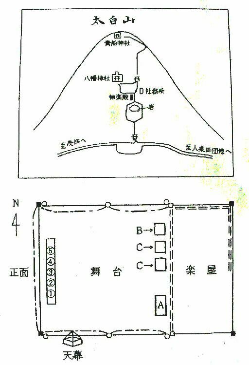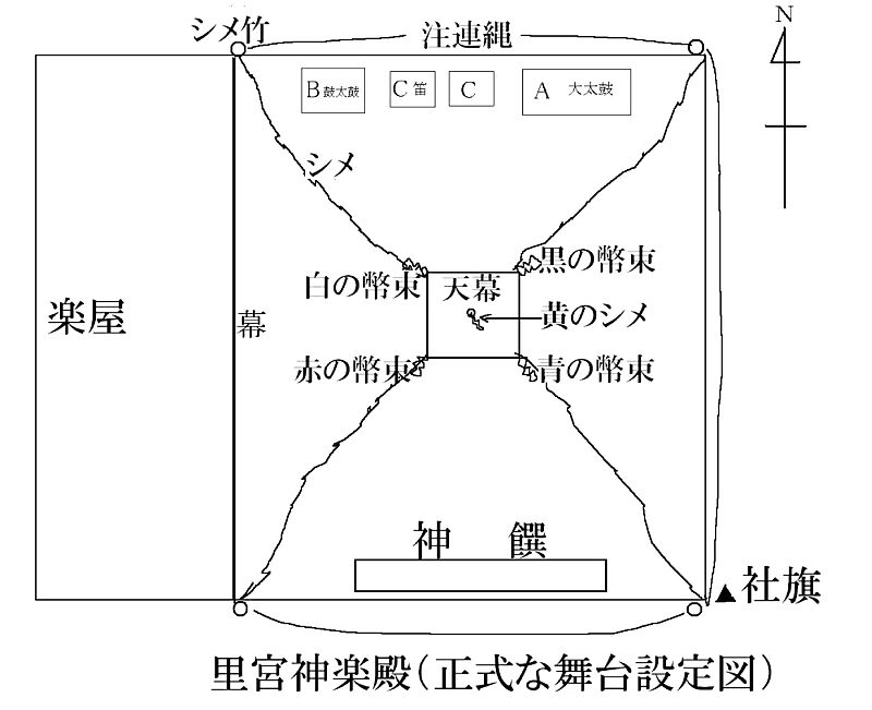 これが正式であるが、通常は舞台の角に天幕を下げ、シメは飾らない。天幕は毎年、神楽師が作る。
