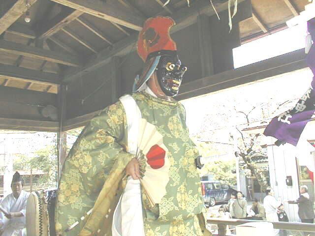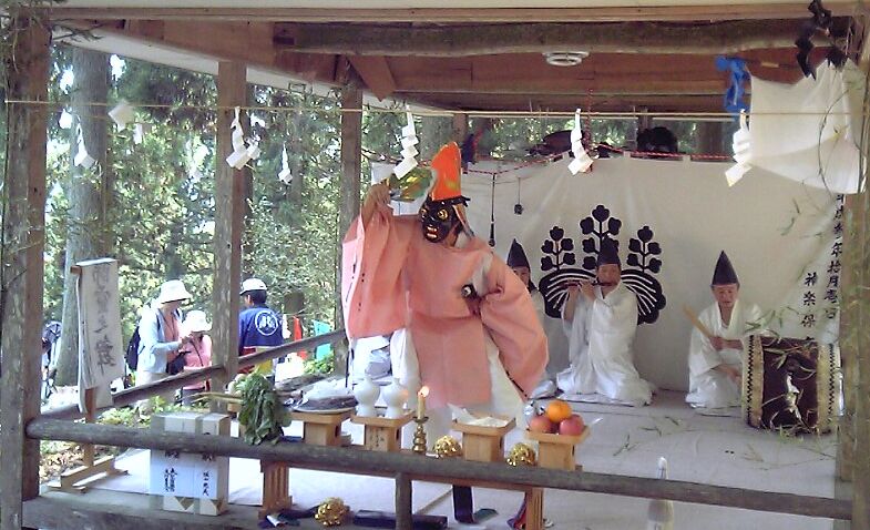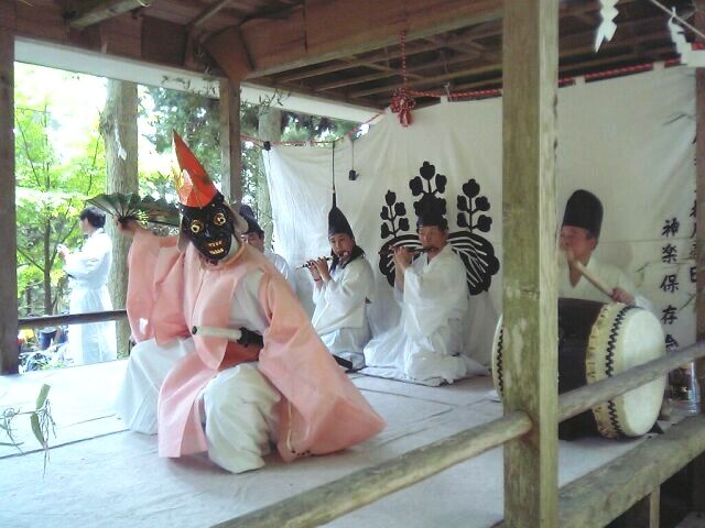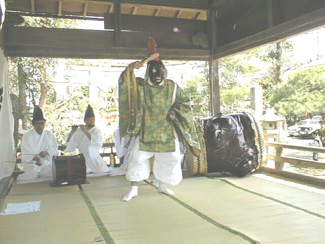 五穀豊穣を祈る舞。舞手は鳥兜をかぶり、目の飛び出た黒色の面をつけ、狩衣を着て、 右手には扇を持つ。扇で顔を伏せるようにして登場した後、正面に向かって足を大きく 広げ腰を落とし、両手を腰に当て、 深々と2回拝礼をして舞に入る。まず、「扇三番」を行う。 (前述の通り)次に、鈴を神前に置き、「種播き」を行う。これは、神饌にある米の入った 三宝を拝み、それを両手に持ちながら大きく舞い、次に、片足で飛び跳ねるようにして回りながら、 右手で三宝の米を摘み、舞台に3度播くものである。播き終わると「鳥追い」を行う。これは三宝を 置き、鈴を右手に、扇を左手に持ち、左右に大きく振りながら舞うものである。次に「御神楽」 (前述の通り)を行う。舞が終わると、登場のときと同様に拝礼をして退く。演技時間は約20分 である。 |